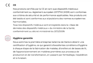 Traitements : CoolPhase avec microcapsules PCM pour une thermorégulation active et Fibersan aux huiles essentielles pour une protection hygiénique anti-acariens